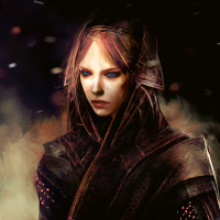 На картинке изображен персонаж, похожий на женщину, одетый в темный плащ с капюшоном, лицо которого закрыто маской. У нее серьезное выражение лица, и она изображена на драматическом фоне, который наводит на мысль о сцене из фэнтези или научной фантастики.