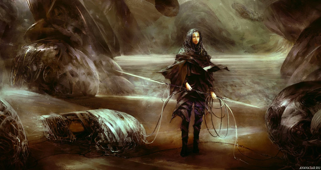 a female character who appears to be in a fantasy or adventure setting. She is standing amidst rocky formations, which might suggest she is in a cave or a rugged