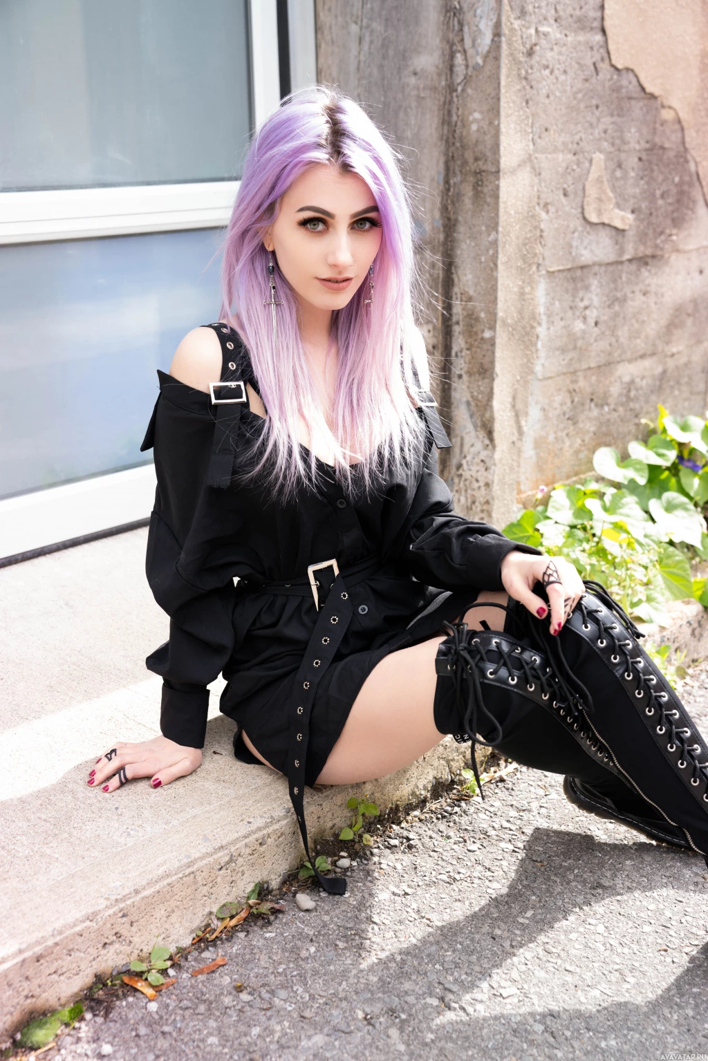 purple hair, sitting on what appears to be a curb or ledge outside. They are wearing