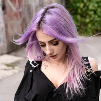 closed eyes, and they have long purple hair. They are wearing