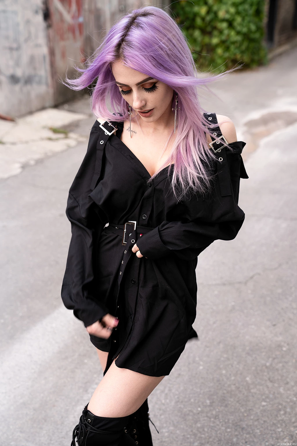 a black dress with a ruffled sleeve design. Their gaze is directed downward, and the background appears to be