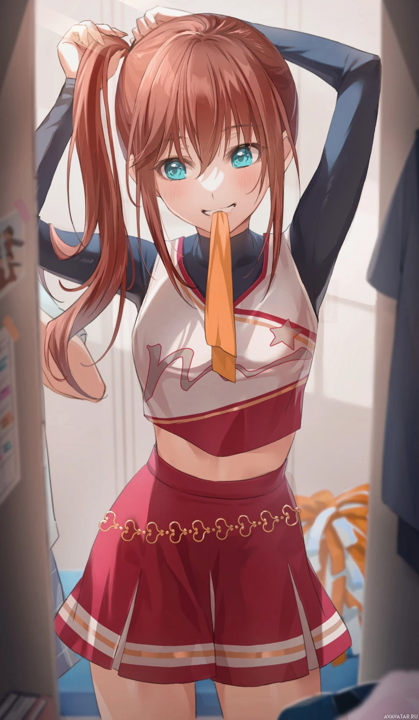 a sleeveless top, shorts, and socks. The character appears to be in the middle of a cheerleading pose or perhaps a stylized performance, as she looks directly at the viewer while holding her hair back with one hand. Her expression is confident and playful. This scene likely comes from