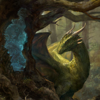 a fantasy scene featuring a dragon. The dragon is depicted with scales and horns, resting within the hollow of