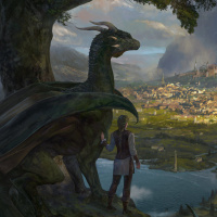 pastoral environment where the interaction between humans (or humanoid races) and dragons could take place. The art style is detailed and realistic, enhancing the fantastical elements within the scene.