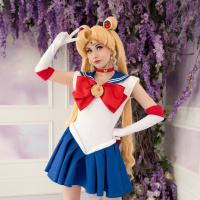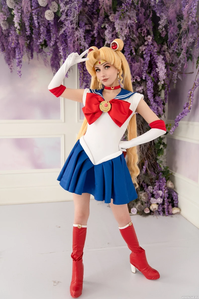 the iconic costume associated with the character Sailor Moon, which includes a short blue skirt, white tank top, red and white boots, gloves, and a headpiece with two buns on either side. The individual is posing with one hand on their hip and the other hand raised to their face in