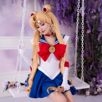 a relaxed pose, wearing the sailor uniform with its distinctive star emblem. The background has a whimsical feel with