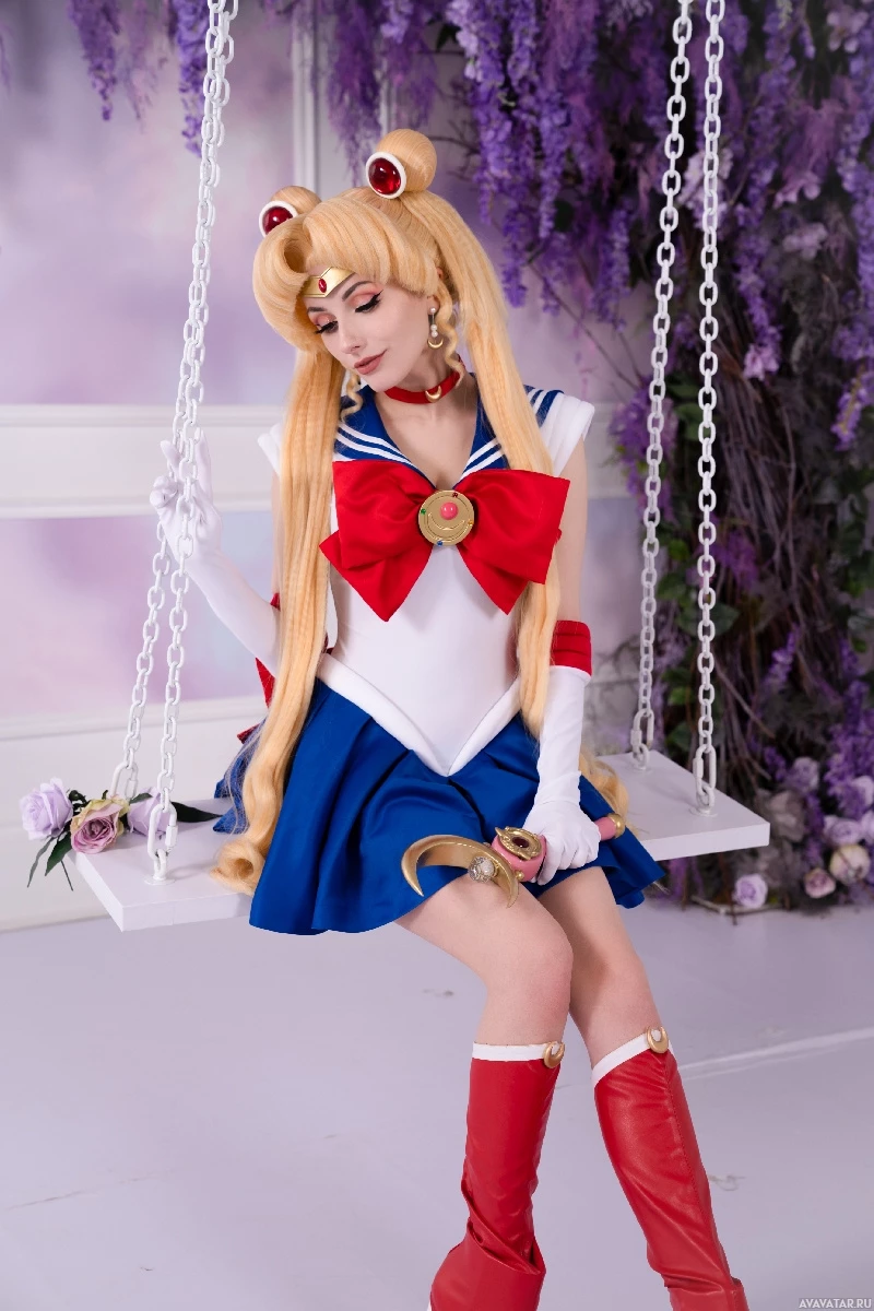 Sailor Moon, a character from the anime series. They are sitting on a swing with their eyes closed and legs crossed in