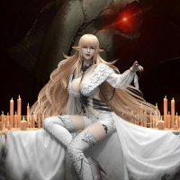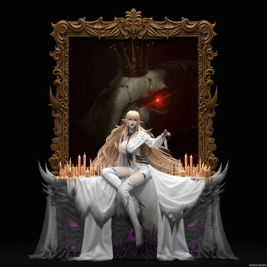blonde hair, dressed in elegant white and silver attire, sitting on a throne with an ornate backdrop that suggests a royal or mystical setting. Behind her, there's a large frame displaying a ghostly image of another creature, which appears to be malevolent due to the red