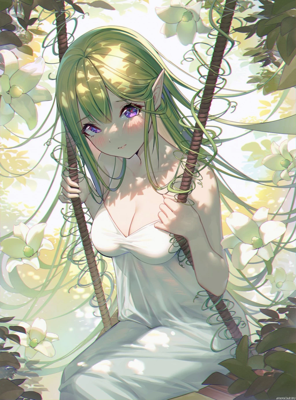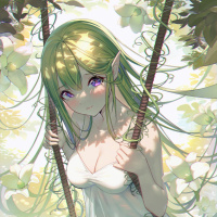 green hair and is sitting on a swing that is surrounded by lush green foliage, possibly in a park or forest setting. The character is depicted with