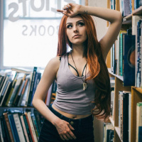 a tank top, and appears to be posing for the photograph. Her pose includes a hand on her head, resting her chin, which gives off a thoughtful or contemplative vibe. The background indicates that the setting might be in a library or a bookstore, as there are books visible on the shelves behind her.
