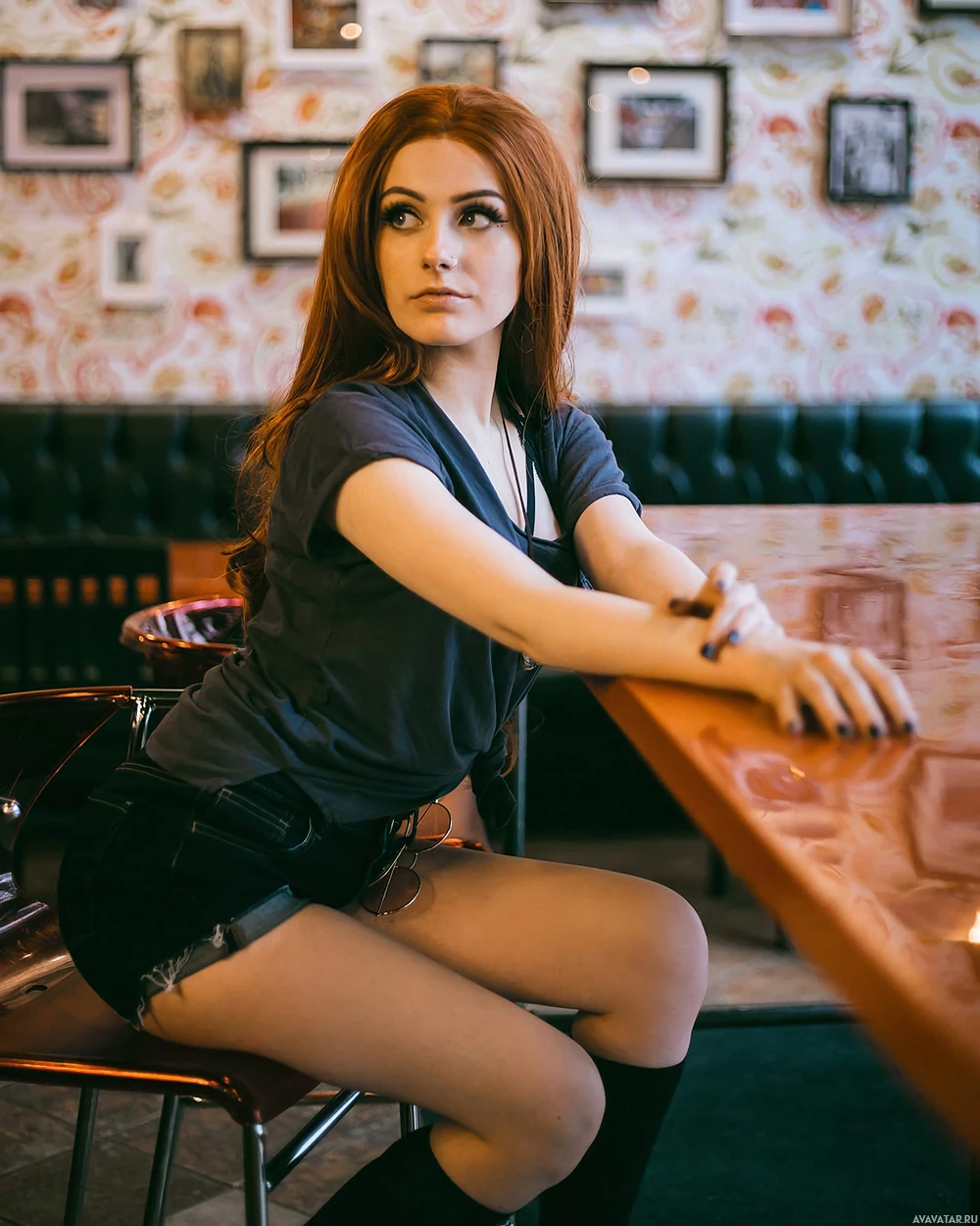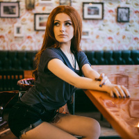 red hair. She is sitting on a chair at a table inside what appears to be a bar or