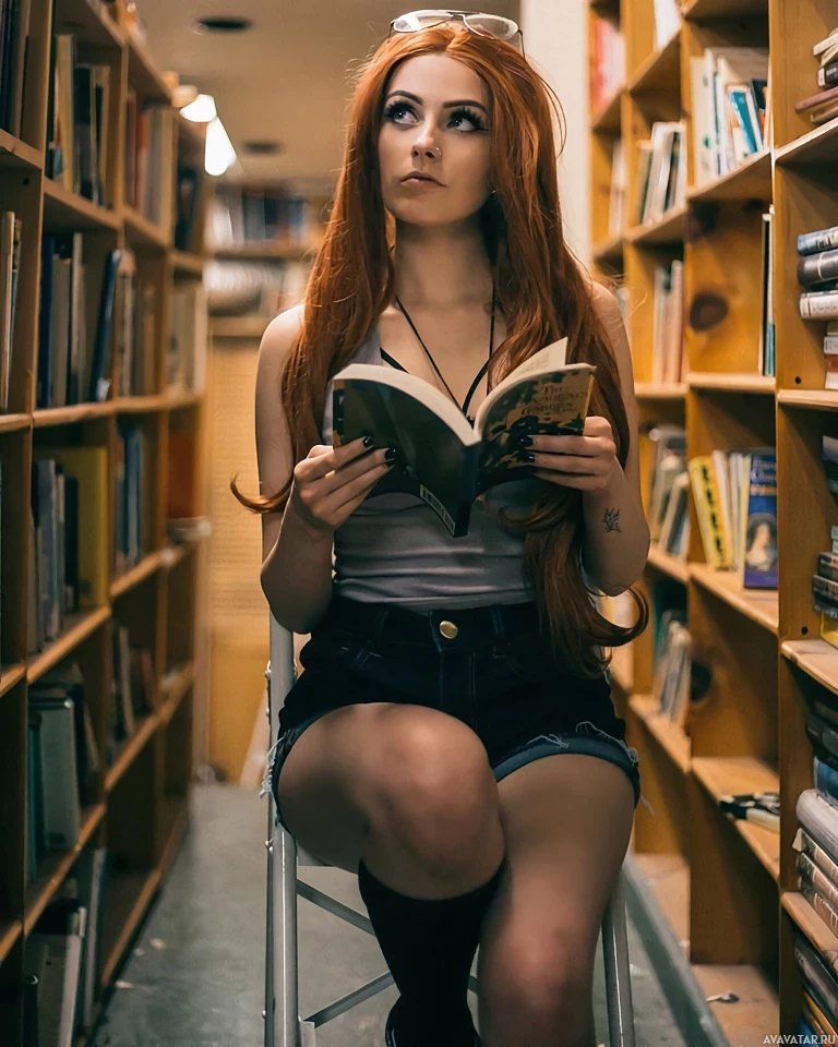 red hair seated on a chair in what appears to be a library or bookstore. She is wearing glasses and has