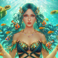 blue hair and is adorned with gold accessories such as bracelets and earrings. Her attire includes aquatic elements like scales and she holds what seems to be an enchanted trident or staff in one hand. The background features a vibrant