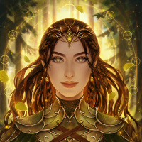 The image shows a fantasy illustration of a red-haired female character. She appears to be wearing armor and has an elaborate headdress that suggests she might have a magical or divine status. The background features what seems to be a mystical forest with glowing symbols, enhancing the otherworldly atmosphere of the image.