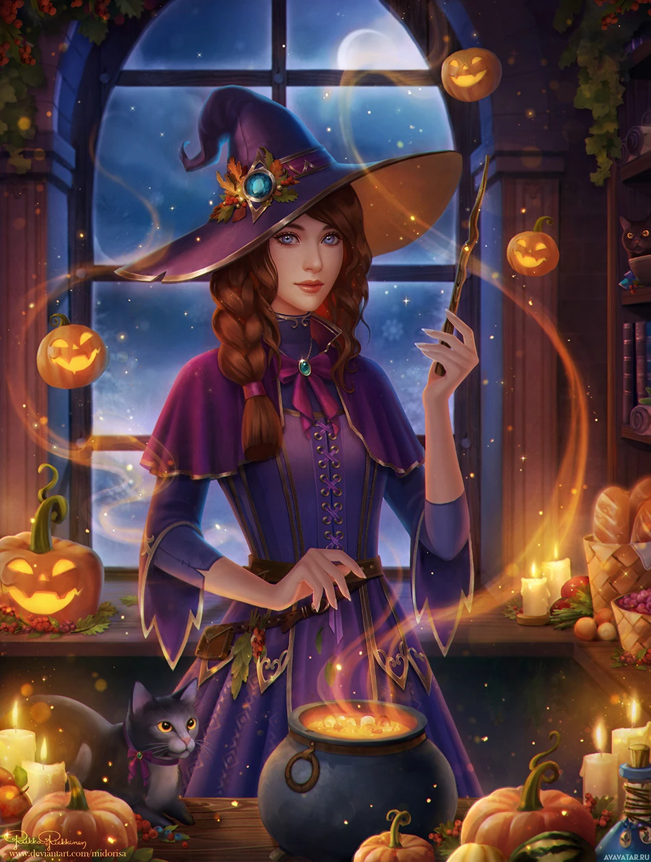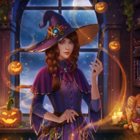 dark hair styled in braids, and she is holding what looks like a wand or a magical tool in her right hand. The background suggests that the setting is Halloween-themed due to the presence of
