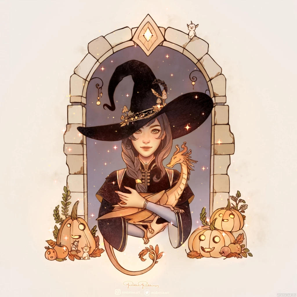 a spider web in the background and pumpkins, which are typically associated with Halloween decorations. To the right side, there's a dragon resting on the floor, adding to the fantasy theme of the image. The witch is wearing a traditional