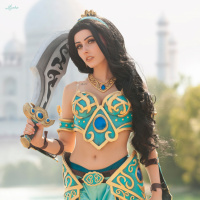 a body of water or a tourist site due to the presence of what looks like a mosque in the background. The photo captures the cosplayer posing confidently while embodying the character's fierce persona from