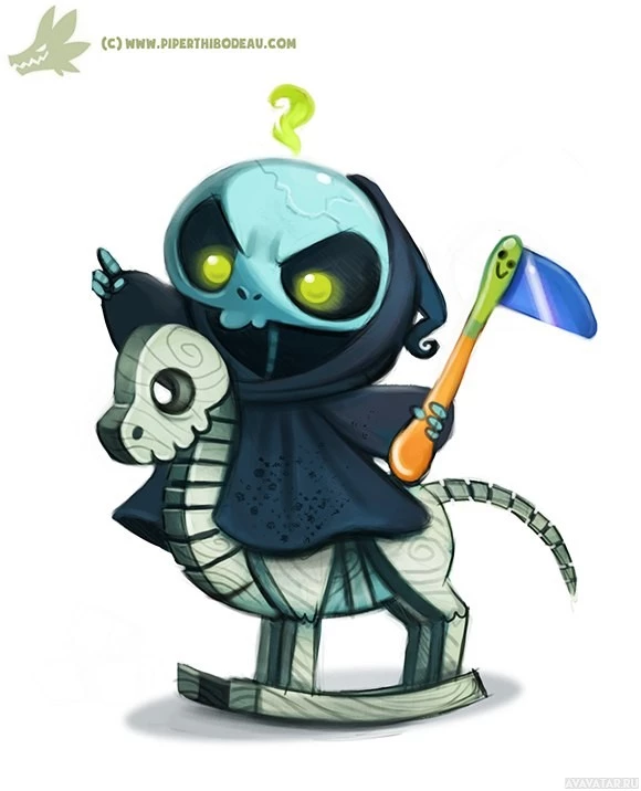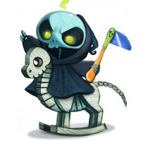 the Grim Reaper riding on the back of an undead horse, which appears to be made out of bones. The character is holding a scythe in one hand and a hammer in the other, both