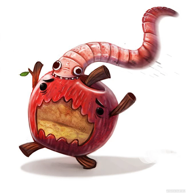 На картине изображена мультяшная иллюстрация яблока с лицом. Внутри яблока есть червь. Яблоко, по-видимому, находится в движении или выражает возбуждение, о чем свидетельствуют его открытые рот и глаза, закрытые в ожидании или радости.