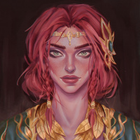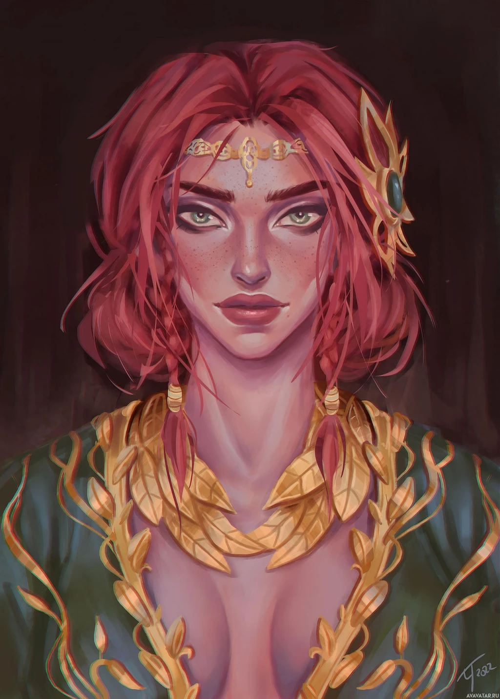 red hair and distinctive style, is portrayed with intricate jewelry and detailed clothing. The artwork captures the essence of the character's persona in the game, showcasing