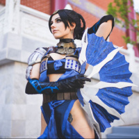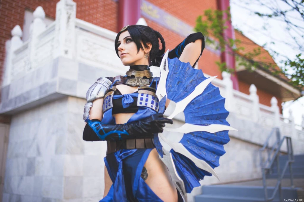 In the image, there is a person dressed in costume. The costume appears to be inspired by Kitana from the Mortal Kombat series of