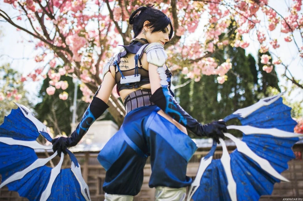 cherry blossoms in the background, creating a picturesque scene that contrasts with the futuristic and warrior-like nature of the cosplay.
