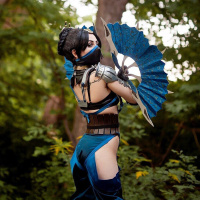 video game franchise. She is wearing armor with a blue and gold color scheme, which matches her character's appearance in the games. She has one hand on a large blue fan and the other holding what appears to be