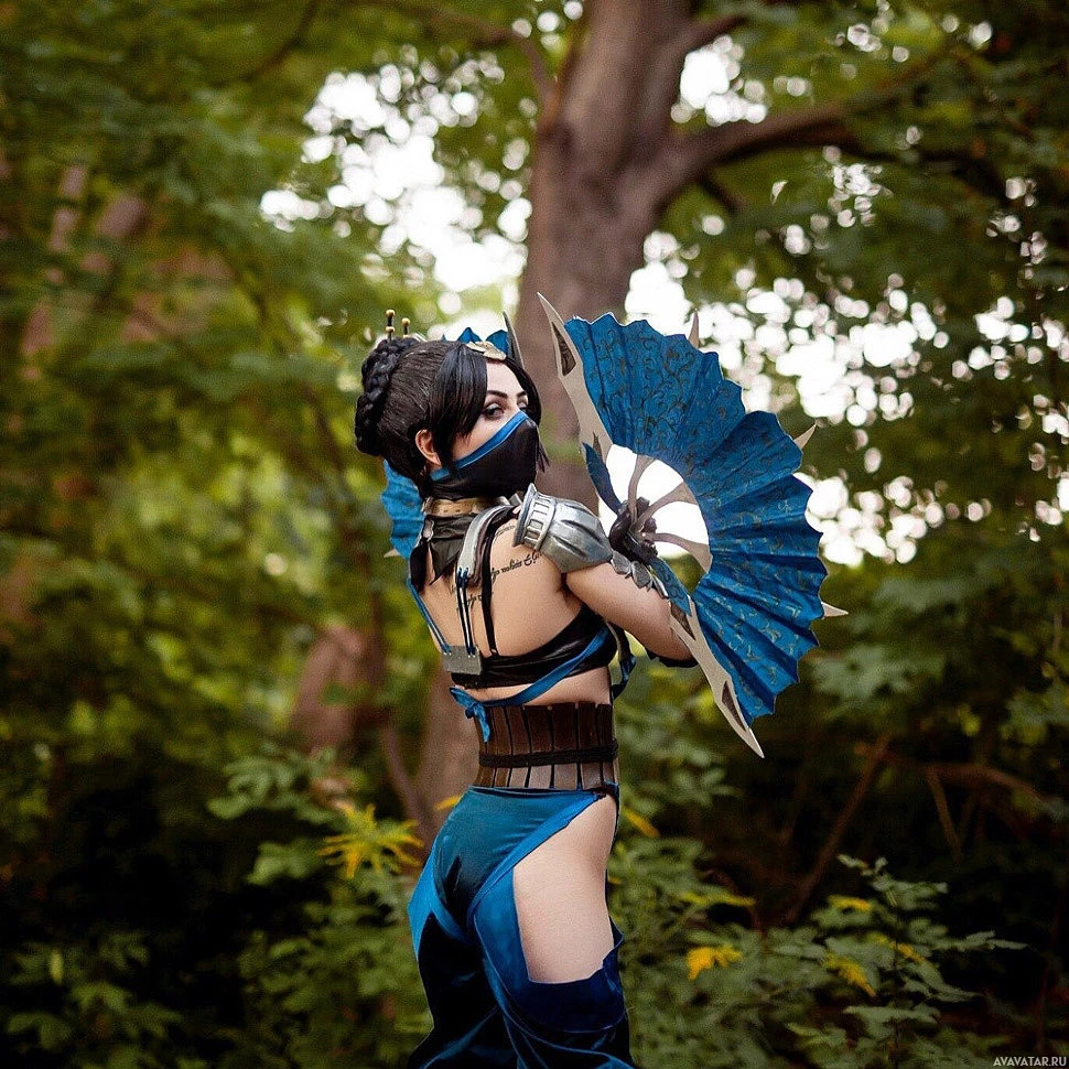 The image shows a person dressed as Kitana from the "Mortal Kombat"