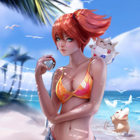 an animated character that resembles Misty from the Pokémon franchise. She is depicted in a beach setting, wearing