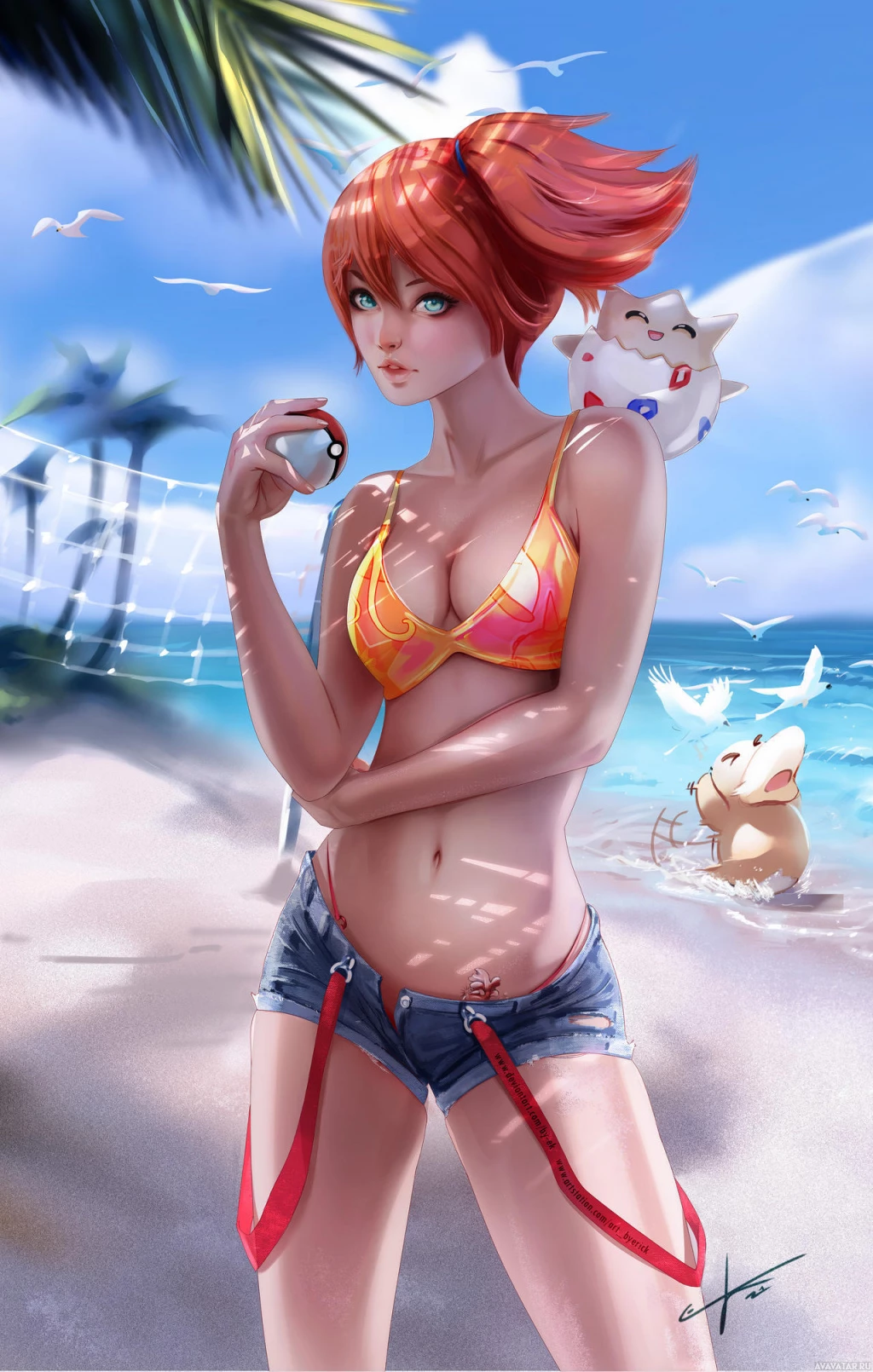 a bikini top and shorts, and holding a Pokéball. There's also