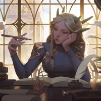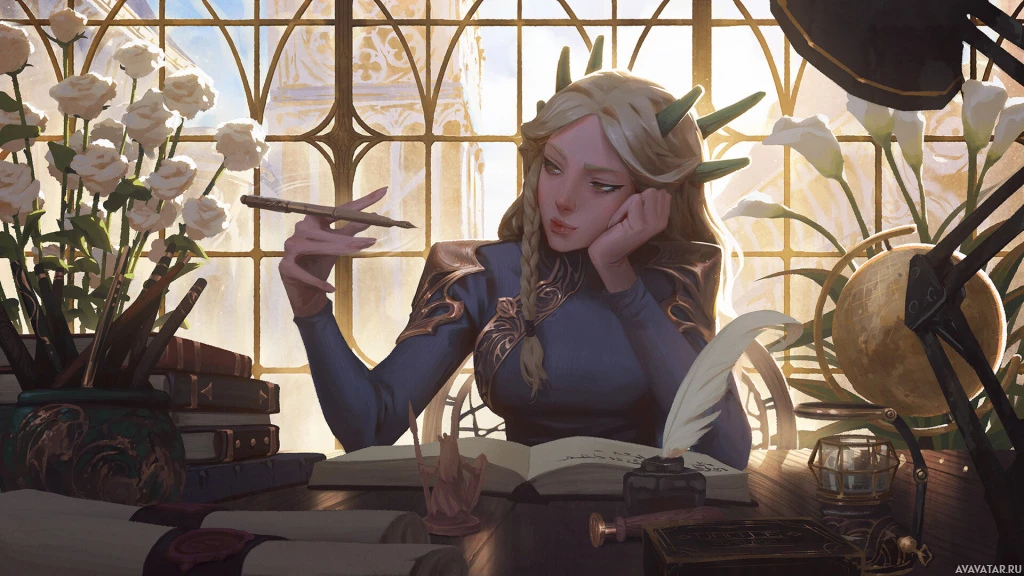 a fantasy world, given the ornate architectural elements and the presence of magical-looking objects like crystals and scrolls. The overall atmosphere is one of