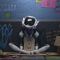 a helmet with visor or goggles on its head. It's sitting cross-legged with one arm resting on its thigh, giving the impression of being in thought or contemplation. On the floor next to it are various items that suggest recent activity, including what appears to be