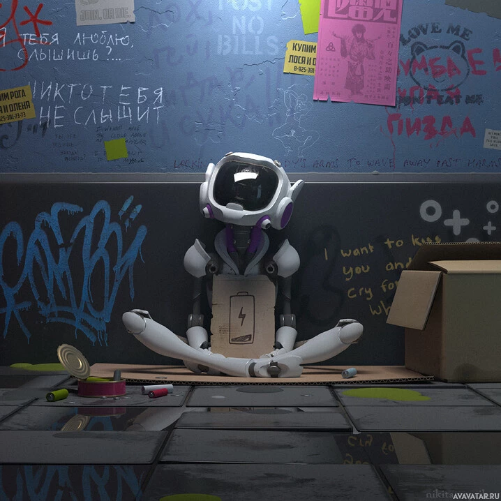 an indoor setting that appears to be a garage or workshop, characterized by walls covered with various types of paperwork and graffiti. The robot has a humanoid shape, wearing a silver-gray outfit with purple highlights, and has
