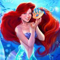The image depicts an animated character that is known as Ariel from the Disney animated movie "The Little Mermaid." She is holding a fish in her hand and appears to be smiling. The background suggests an underwater environment, with bubbles indicating she is diving or breathing underwater.