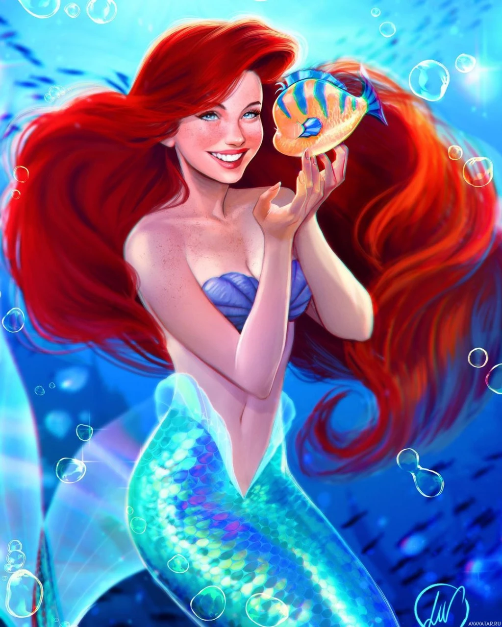 На картинке изображен анимационный персонаж, известный как Ариэль из диснеевского мультфильма "Русалочка". Она держит в руке рыбу и, кажется, улыбается. На заднем плане изображена подводная среда, а пузырьки указывают на то, что она ныряет или дышит под водой.