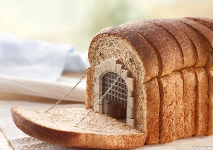 Картинка показывает буханку хлеба, которая была вырезана и устроена так, чтобы напоминать дом с аркой или дверным проемом, врезанным в него, открывая интерьер. Скорее всего, это творческое представление хлеба, предназначенного для украшения или развлечения, а не функциональная съедобная структура.
