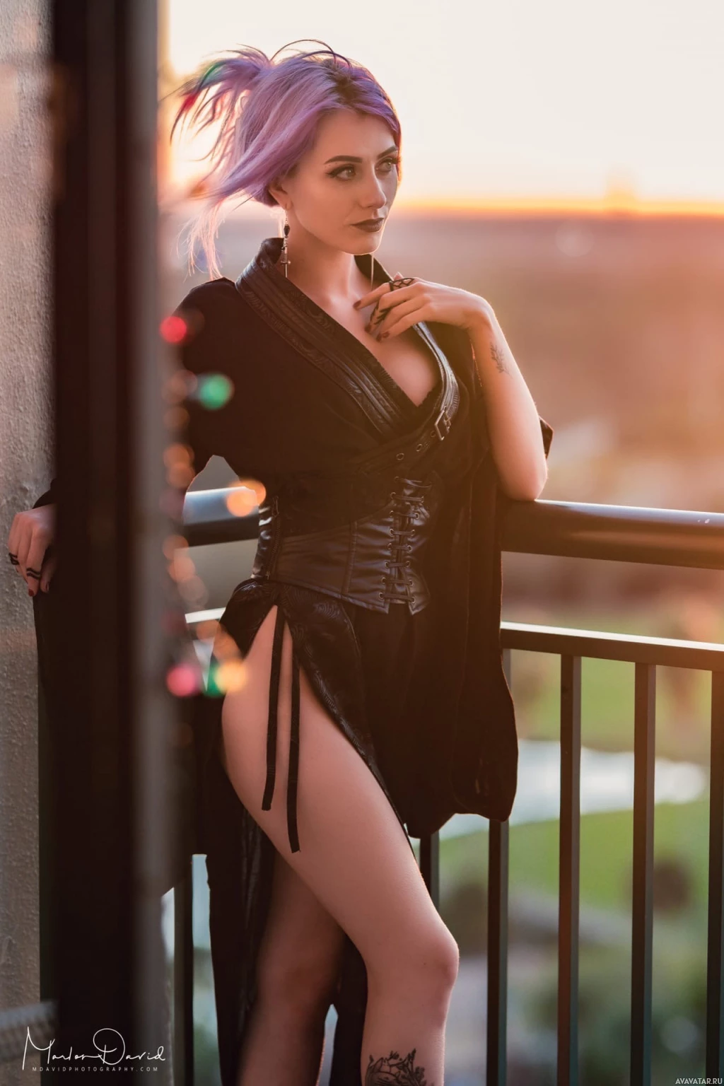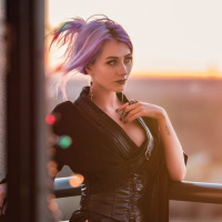 a dark hue and includes elements like what seems to be a corset or bodice top. The setting is at dusk or early evening, as indicated by