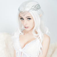 white hair and are styled to resemble an elf, with pointed ears visible on the head. The individual is wearing lingerie that includes a bra and a pair of panties. The background features what appears to be white and gray gradient, which could be an intentional