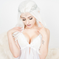 white hair and closed eyes, dressed in a fantasy-themed costume that includes white lingerie or underwear. The individual is wearing what appears to be a necklace or accessory on the forehead, which complements the fantasy theme of the attire. The background is plain and does not distract from the subject. This image may fit into categories related to cosplay, fantasy-themed fashion, or role-playing themes.