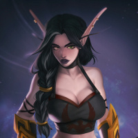 dark hair, green eyes, and pointed ears characteristic of fantasy races such as elves. The character is wearing a black and red top with
