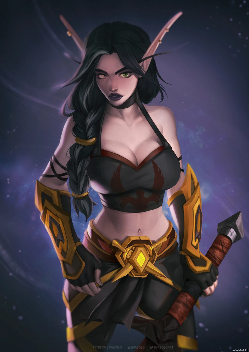gold accents, suggesting armor or a specialized outfit, and she's holding what appears to be a weapon in her right hand. The background has cosmic elements, indicating that the setting might be otherworldly or fantastical in nature.