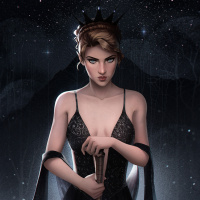 a dark dress with intricate details and has a sword at her side. Her expression seems serious or contemplative. The background suggests a cosmic or