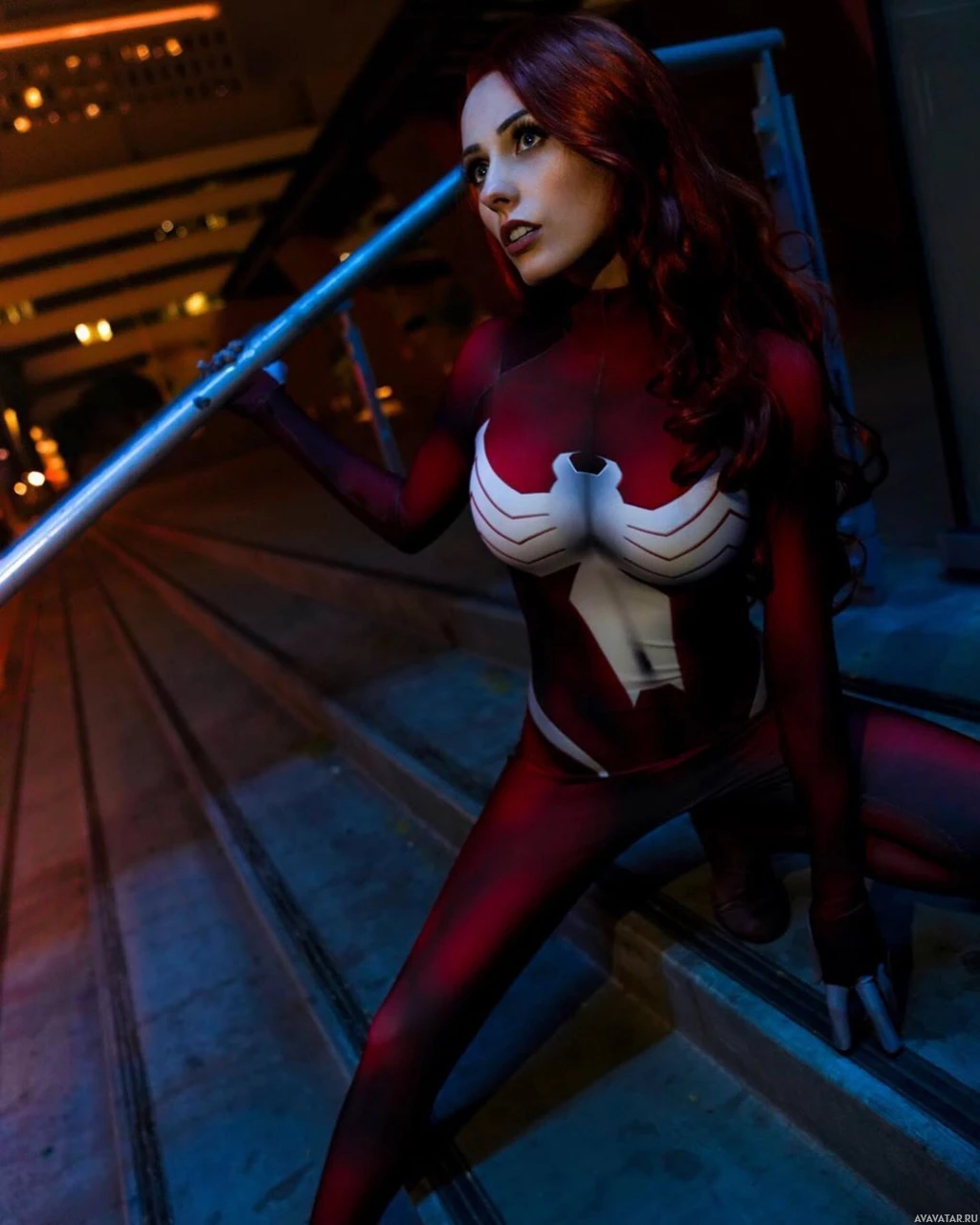 an urban stairway at night, with dim lighting and city buildings visible in the background. The individual is holding a staff or weapon that complements their character's appearance. The costume is detailed and includes elements typically associated with Spider-Woman such as the red and white suit, hair, and accessories.