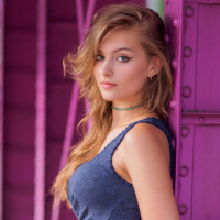 a young woman with shoulder-length red hair posing against a purple background. She is wearing