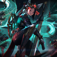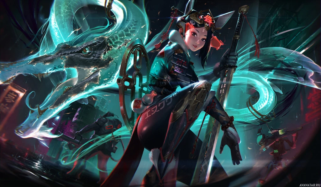 На картинке изображен персонаж, который выглядит как девушка с темными волосами. Она держит меч и, похоже, находится в научно-фантастическом окружении. Вокруг нее есть различные элементы, которые наводят на мысль о фантастическом или потустороннем окружении.