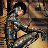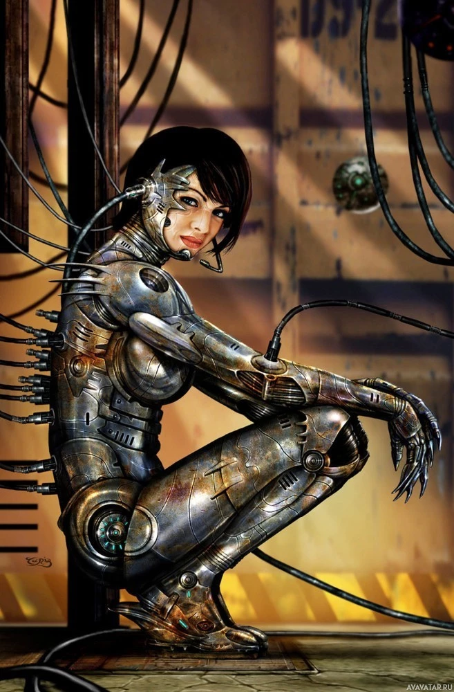 a science fiction-themed robot. The robot has a humanoid form and is wearing a metallic skin with visible wiring and mechanical components suggesting