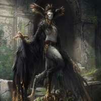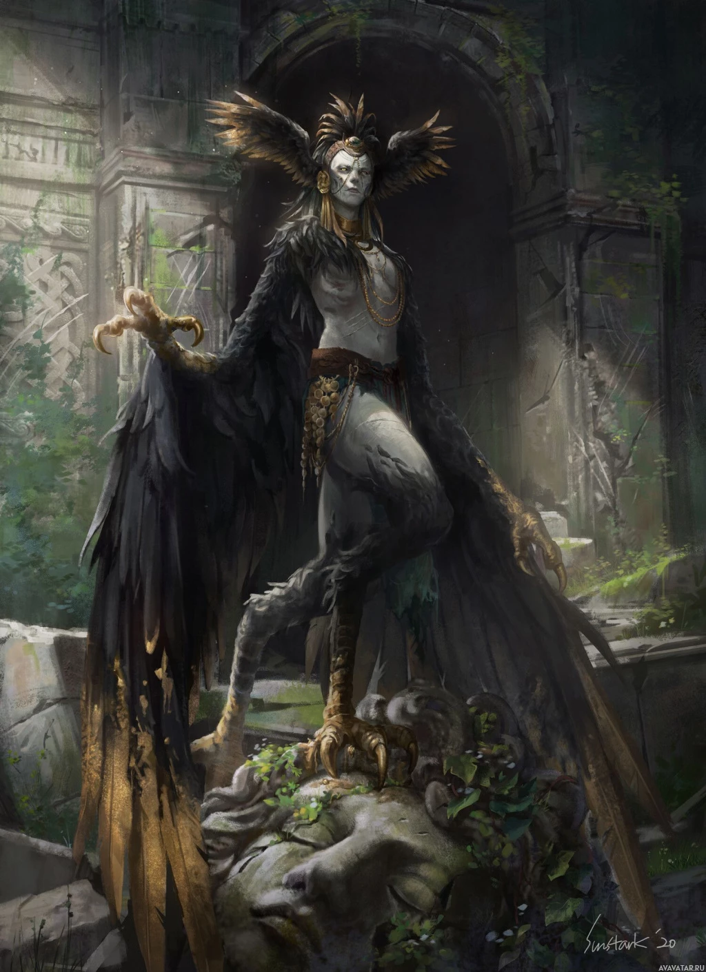 large wings that are spread out wide behind it, giving the impression of flight or power. The harpy is adorned with various items that resemble traditional