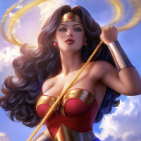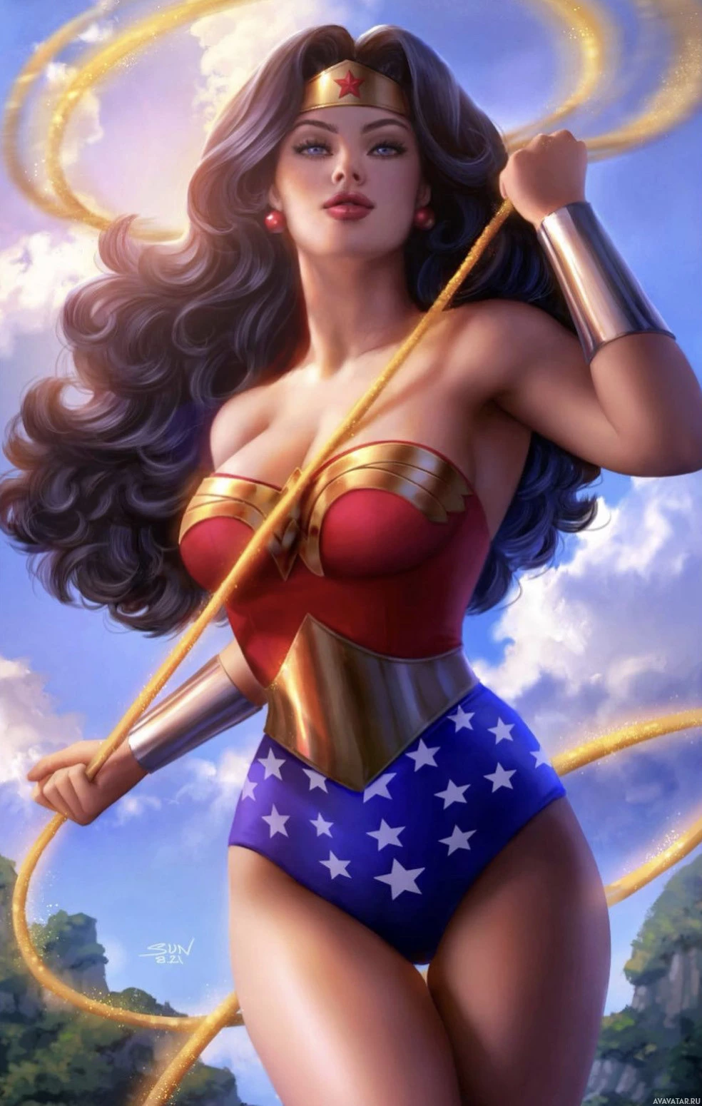 iconic costume, which includes a corseted top, golden tiara with red star, bracelets, and a lasso of truth. Her pose suggests that she is ready for action or about to use her lasso to compel an opponent to tell the truth. The setting appears to be outdoors during daytime, with