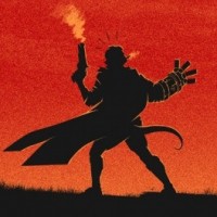 The image shows a silhouette of a character that resembles Hellboy, an iconic comic