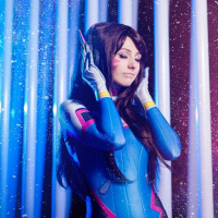 body suit that resembles the D.Va armor in the game, which includes pink and blue colors with